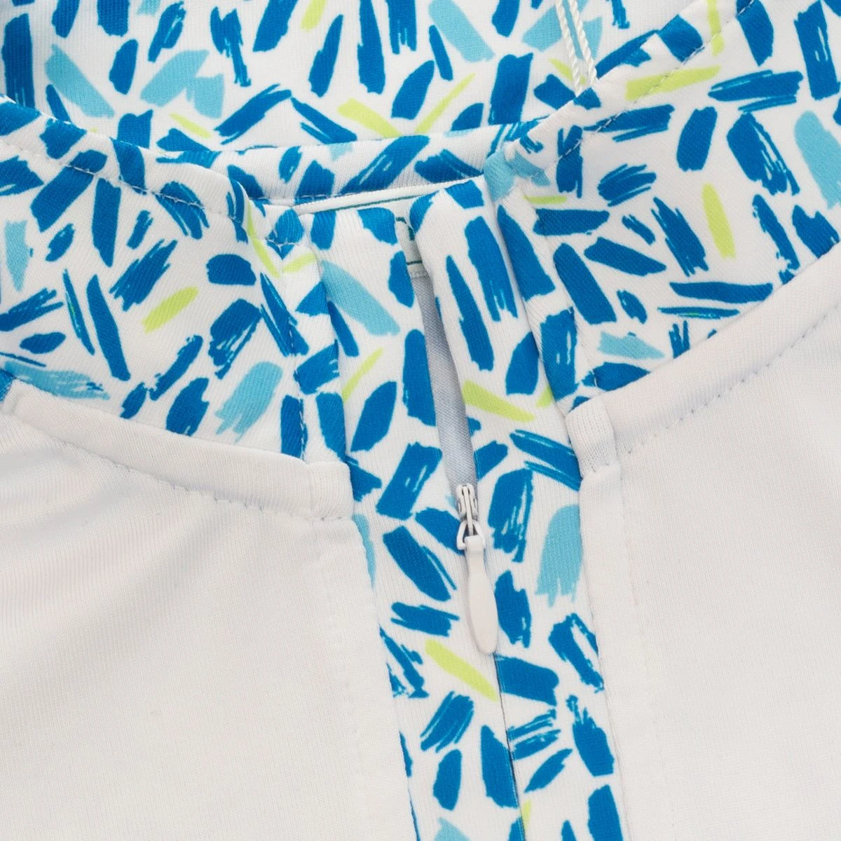 - Printed panels at sides and sleeves Self-fabric high collar with front zip opening