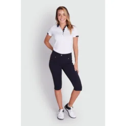 Experience a great fit that will leave you feeling comfortable throughout your round in these black Green Lamb Ladies Tasha Golf Pedal Pushers. Designed with style, you’ll find front and back seaming for a tailored shape, and fashionable additions of silver metal logo rivets.