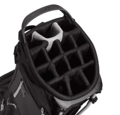 Full-length dividers are included to keep clubs organized and separated. A self-adjusting strap system conforms to any body type, while the patented smooth release, collapsible base system ensure no club crowding occurs. The patented Cart Strap Pass Through allows easy access to oversize apparel and valuables pocket.