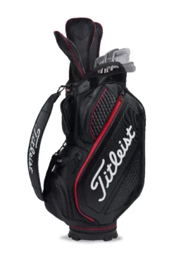 Titleist’s new Jet Black StaDry Premium Cart Bag os an exquisite bag made with luxurious materials with enough bells & whistles for an amateur or serious golfer to use. The 15-Way top with full-length dividers has plenty of options for you to organize your clubs in a way that suits you. Easy Lift Handles & Molded base with trolley grooves makes mounting your bag simple and easy. 11 unique pockets from full-size apparel pockets to waterproof valuables pockets this bag has more than enough pockets for all of the storage you could ever need.